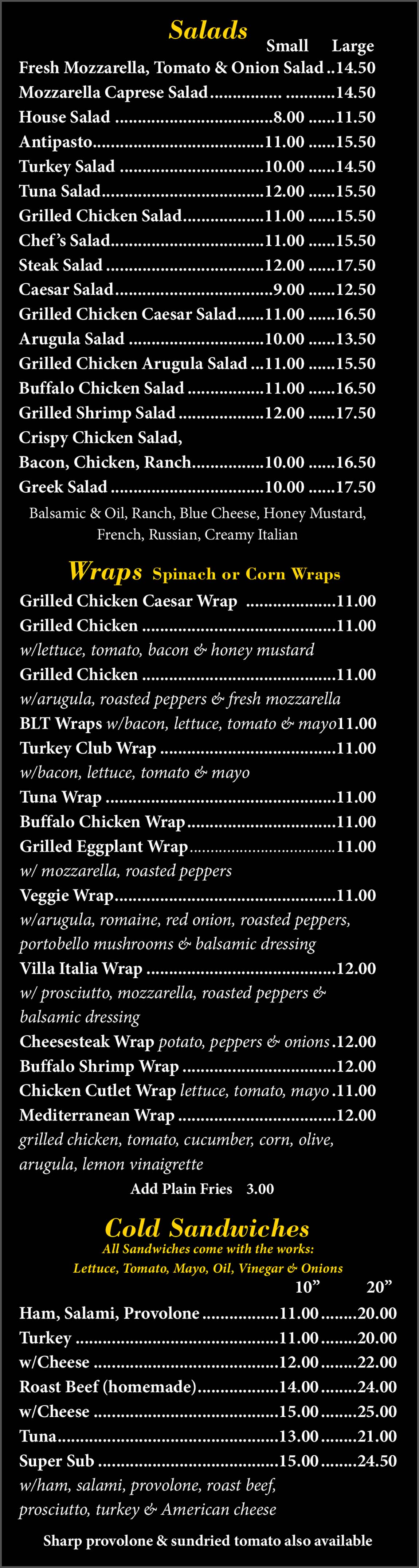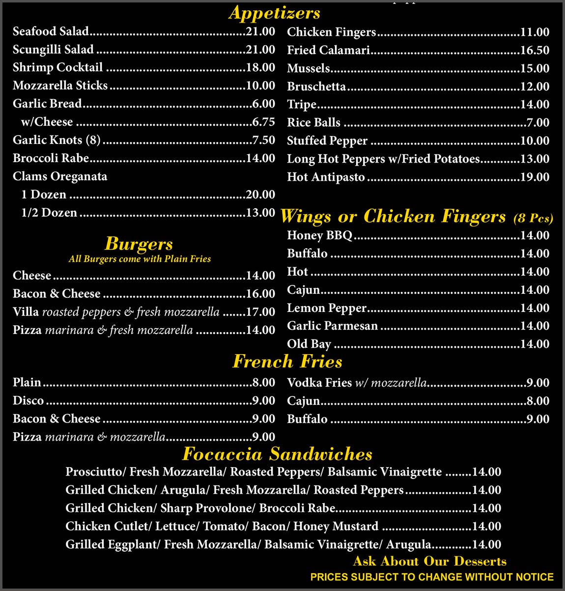 • Appetizers/Salads/Burgers/Focaccia/Wings